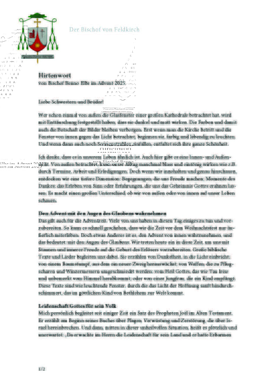 Hirtenbrief von Bischof Benno im Advent 2025